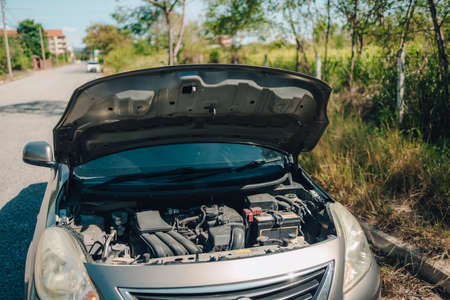 Car broken, car breakdown open car hood, bonnet on roadside hot day.