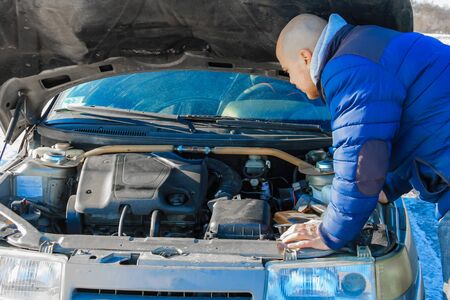 Man open hood of the car and trying to find out what is happened with car. Winter outdoors