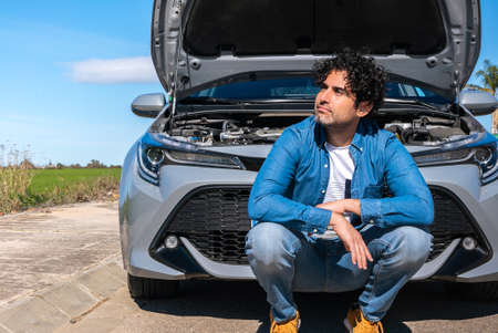 Stressed man sitting after a car breakdown with popped up hood at the side of the road, waiting for towing service for help car accident on the street.