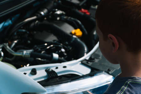 Close-up of the diesel engine of the car. The master repairs the car in the garage. Car service for repair of vehicles