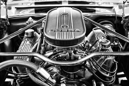 BERLIN - MAY 11 Engine Shelby Mustang GT350, black and white, close-up, 26th Oldtimer-Tage Berlin-Brandenburg, May 11, 2013 Berlin, Germany