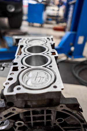 Engine valve car maintenance. The cylinder block of the four-cylinder engine. Disassembled motor vehicle for repair.