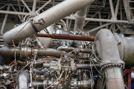 Older Russian helicopter from 80s era motor turboshaft or engine cut through detail - displayed at weapons exhibition