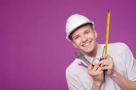 Confident architect smiling and wearing a safety helmet, construction industry and engineering concept