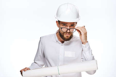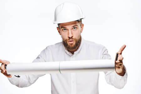 Engineer with a beard on a white isolated background holds a blueprint, builder.