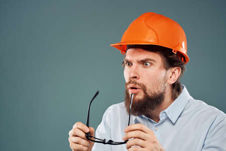 Builder in helmet, construction helmet, builder with drawing, builder wearing glasses on isolated background.