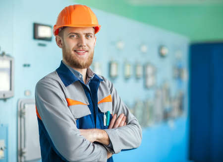 Factory worker man with clipping path smiling with arms crossed on blurred background