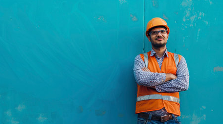 Portrait of Asian engineer in hardhat standing with arms crossed on blue background