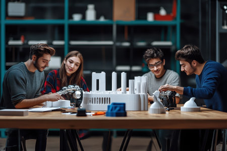 Three young men work together on various 3D printed models in a warm, well-lit workshop, focusing on their tasks.