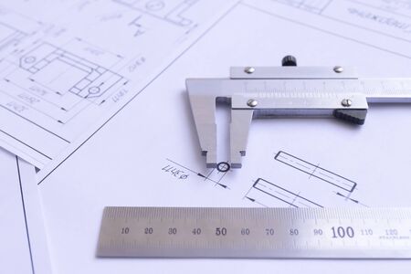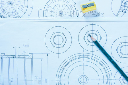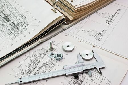Several Technical engineering drawings, which show mechanical parts engineering components and assemblies for their manufacture in industry. Factory Industry Industrial work project blueprints measuring tools