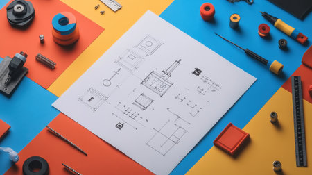 A vibrant flat lay image featuring engineering design and various tools on colorful surfaces. Perfect for showcasing creativity in workspace organization and project planning.