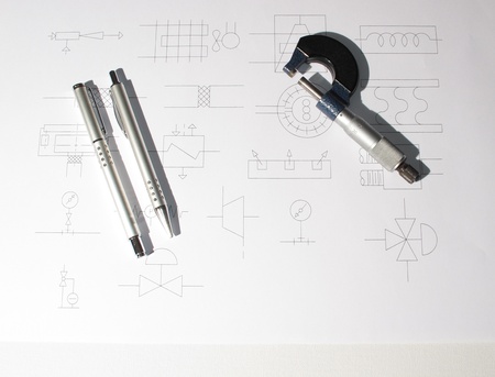 An image showing Pens, a micrometer and a precision mechanical diagram