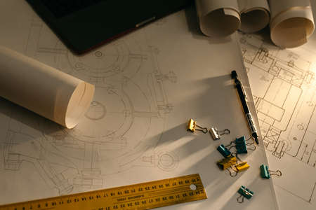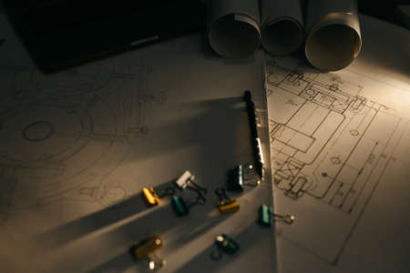 architectural projects office working with blueprints.Selective focus.Vintage tone with sunset background.