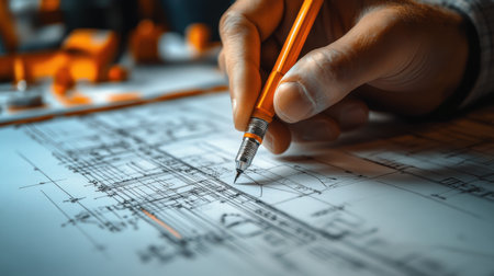 Engineer working on blueprint, closeup of hands. Engineering concept, Engineer skillfully designs intricate structures, AI Generated