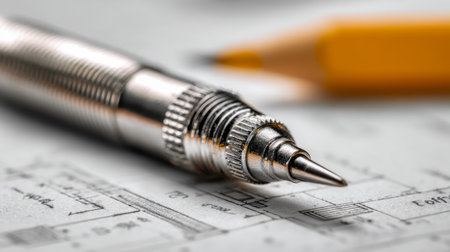 A sleek mechanical pencil lies atop an intricate architectural plan, with a rustic wooden pencil softly blurred in the backdrop, capturing creative precision and pla