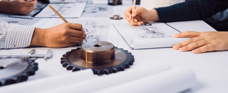 A group of engineers collaborating on mechanical designs in a bright workspace, showcasing tools, blueprints, and hands actively sketching ideas for innovative projects.
