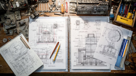 A detailed engineering draft lies on a rustic wooden table, showcasing precise sketches and mechanical components, highlighting the world of industrial design.