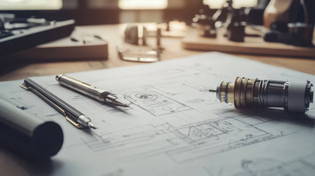A close-up of engineering tools resting on a detailed blueprint in a cozy workshop. The warm golden hour light enhances the creative atmosphere, highlighting the precision and craftsmanship involved.