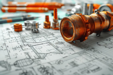 Technical drawing and engineering tools on a blueprint, showcasing precision and creativity in design for engineering projects