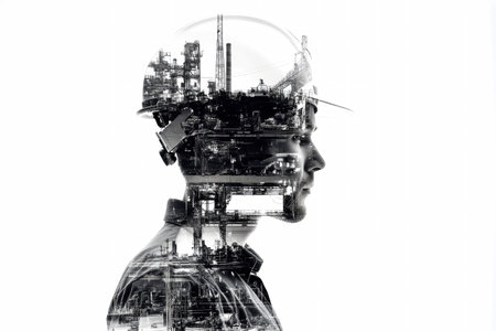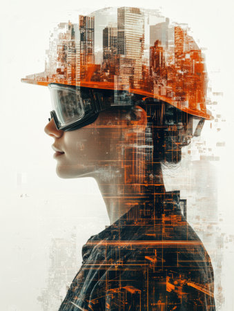 An engineer in uniform, featuring a double exposure with industrial structures, reflects the blend of construction and innovation.
