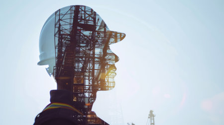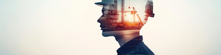 A builder in safety gear stands confidently, merging his silhouette with an industrial landscape, symbolizing engineering and construction.