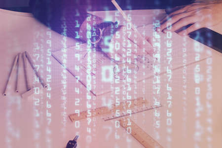 Humans hands with data theme multi exposure background drawings. Concept of innovation.