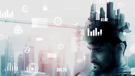 Double exposure image of man engineer overlay with building architecture cityscape. creation city concept.
