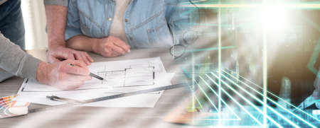 Architects working on blueprint of new construction project; multiple exposure