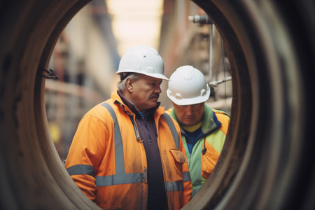 workers with helmets inspecting steel pipes