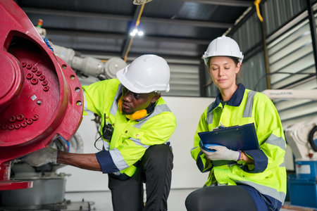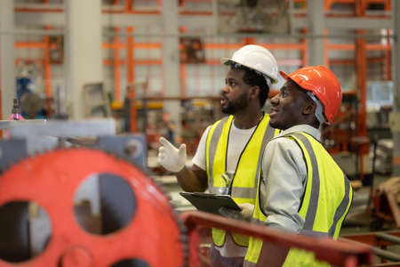 African American engineer skills quality, maintenance, training industry factory worker , warehouse Workshop for factory operators, mechanical engineering team production.