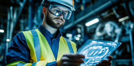 A man wearing a hard hat and safety glasses is looking at a tablet. He is likely a worker in a hazardous environment, such as a construction site or a factory