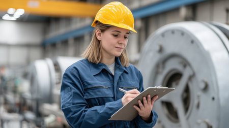 A young female engineer in a blue jumpsuit and yellow hard hat takes notes on a clipboard at an industrial site, showcasing focus and professionalism amidst machinery.