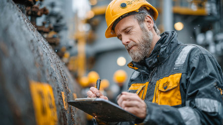 Industrial engineer in a yellow hard hat and rain gear writing on a clipboard during an inspection in a large metal pipeline facility.