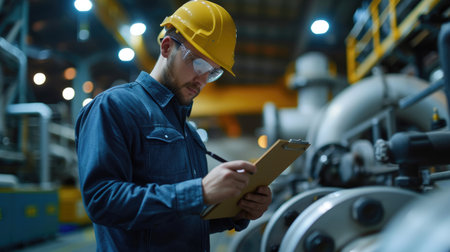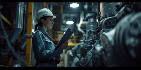 Smart engineer checking iron machine in factory while wearing safety helmet. Professional industrial worker repairing or examining machinery part or turbine machine while holding chart form. AIG42.