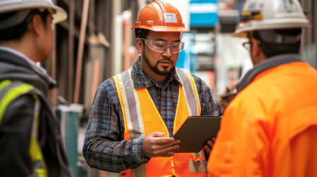 Construction Worker Reviewing Plans in a Modern Industrial Setting During the Day