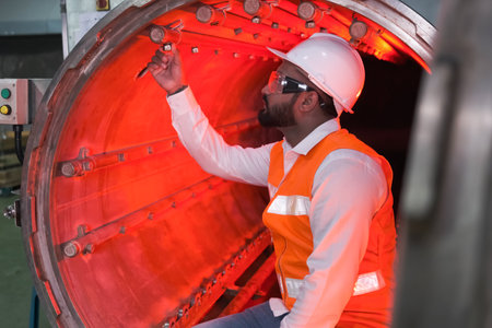 South asia male factory worker or Man engineer or expert staff wear safety vest and helmet of maintenance and checking steam boiler