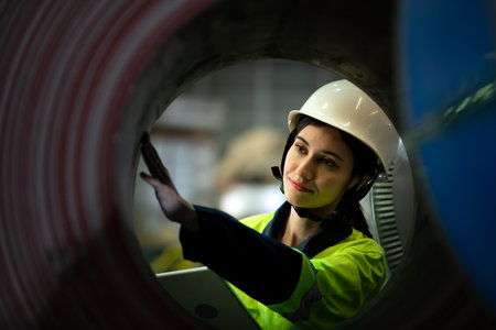 Portrait of a heavy equipment female engineer from a huge industry who came to inspect the metal sheet factory's machinery.