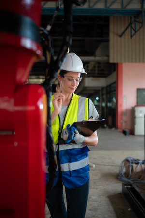 woman working engineering or technical inspection the system of machinery to ensure working in order by checklist part and quality control, workplace with teamwork together