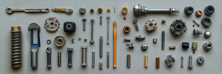 A detailed arrangement of various mechanical parts and tools on a light surface, showcasing elements used in engineering, assembly, and manufacturing applications.