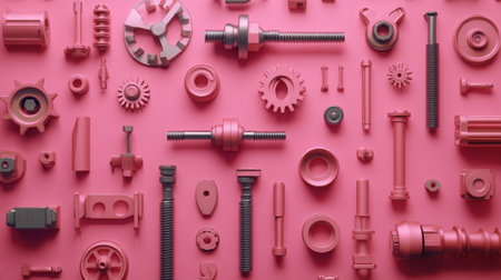 A striking arrangement of mechanical parts set against a vibrant pink background. Showcasing various tools and components, this image emphasizes creativity and industrial design. Perfect for projects focusing on engineering, technology, or artistic expressions.