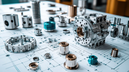 A modern workspace featuring various precision metal parts and components, highlighting the intricacies of engineering and manufacturing processes.
