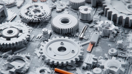 A visually striking arrangement of precision mechanical components and tools showcasing intricate designs. Ideal for engineering and industrial applications.