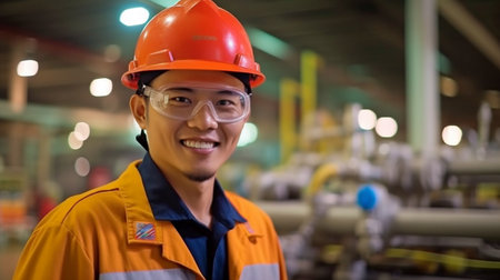 Portrait of a young Asian worker wearing safety helmet and overalls