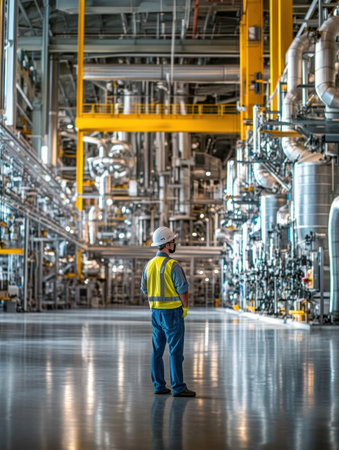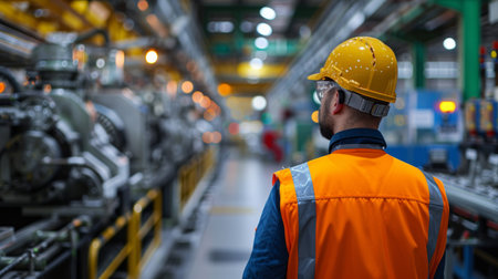 Safety engineer in industrial facility, wearing helmet and reflective vest, overseeing operations in a manufacturing environment.
