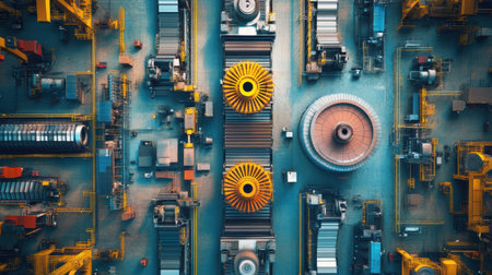 This aerial view captures the complexity of an industrial factory, showcasing large machinery, gears, and a turbine set within a vibrant production environment.