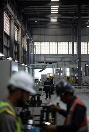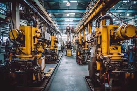 a busy factory floor with workers operating machinery and moving materials, created with generative ai
