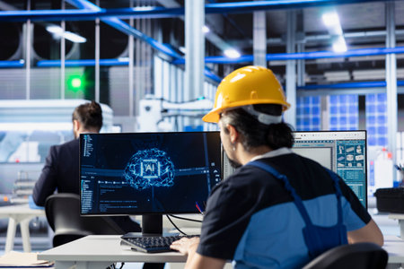 Engineer developing AI diagnostics tool in photovoltaic factory to predict component failures. Solar panels plant technician coding artificial intelligence algorithms to enhance predictive maintenance