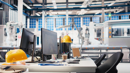 Research and development photovoltaics factory office used to oversee performance of robot arms placing solar panels on assembly lines. Panning shot of empty facility floor with solar plant machinery