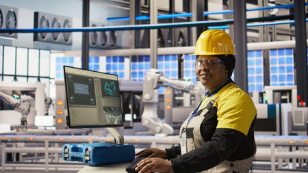 Woman in gray work attire and yellow hard hat interacts with control panel in industrial environment, demonstrating expertise and concentration on machinery functions, AI generated