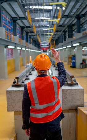 Vertical image back of technician worker with safety uniform show body signal to electrical or metro train and stand in front of railroad tracks in factory workplace.
